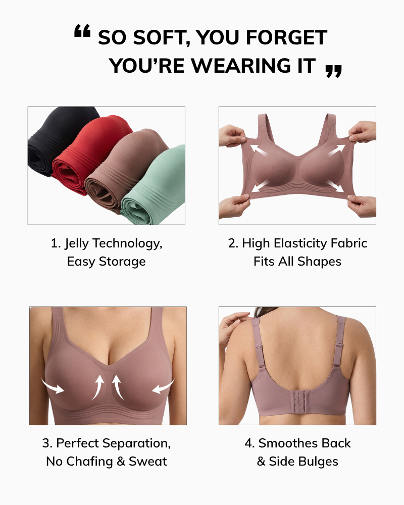 The secret is in the jelly padding—it molds to your exact shape for personalized support without rigid wires or painful poking. Unlike every other wireless bra that promised comfort but delivered floppy disappointment, our jelly material creates real structure while staying buttery-soft.